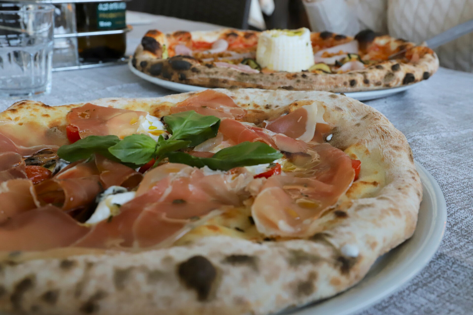 Pomodoro, mozzarella, burrata, prosciutto cotto, zucchine grigliate, cipolle tostate, aceto balsamico